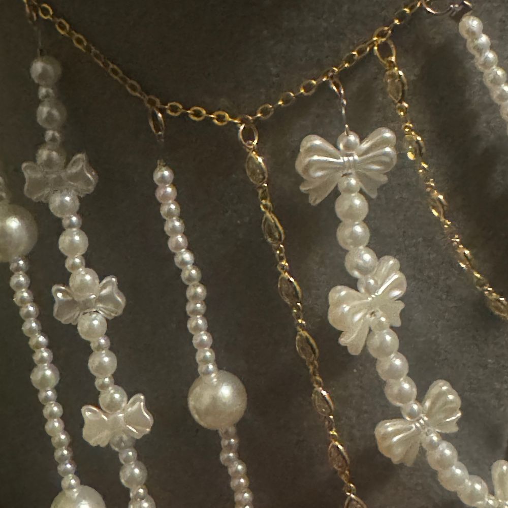 Handcrafted strand by strand, this piece features layered faux pearls, sculpted draping, and cascading beadwork that moves fluidly with the body. Gold-toned chain accents add warmth and elegance, creating a piece that feels intimate, intentional, and enduring.